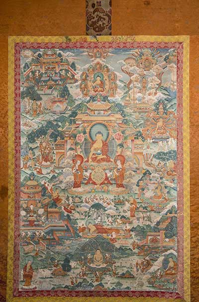 此巨幅唐卡以令人驚嘆的構圖,典雅的設色,高超的繪畫技藝,完整的講述了釋迦牟尼佛慈悲濟世、智慧圓滿的一生的應化事跡。