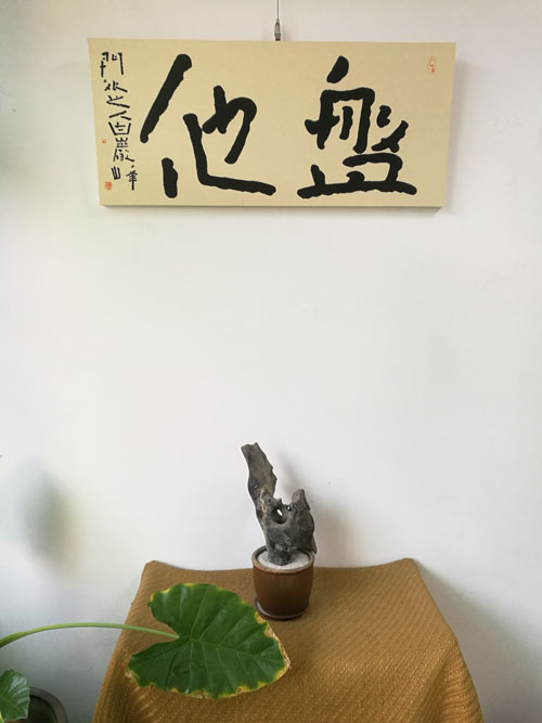 墨古堂一隅巖峰君天性好靜訥言,深居淺出的他以一顆平和清澈的心靈把工作室的每一個角落都打磨得文雅細膩。一石、一席抑或文竹掩映下空無一物的畫框都是主人一塵不染的“素心”所致,那些偶然閃現的青苔、菖蒲、吊蘭、枯石所構成的小院芬芳便是他的桃花源,如此景致,怎一個“講究”了得。如是,“養花沏茶、寫字做飯”早已成為他井井有條的日常生活,也是他“平常心”外化的修行方式。